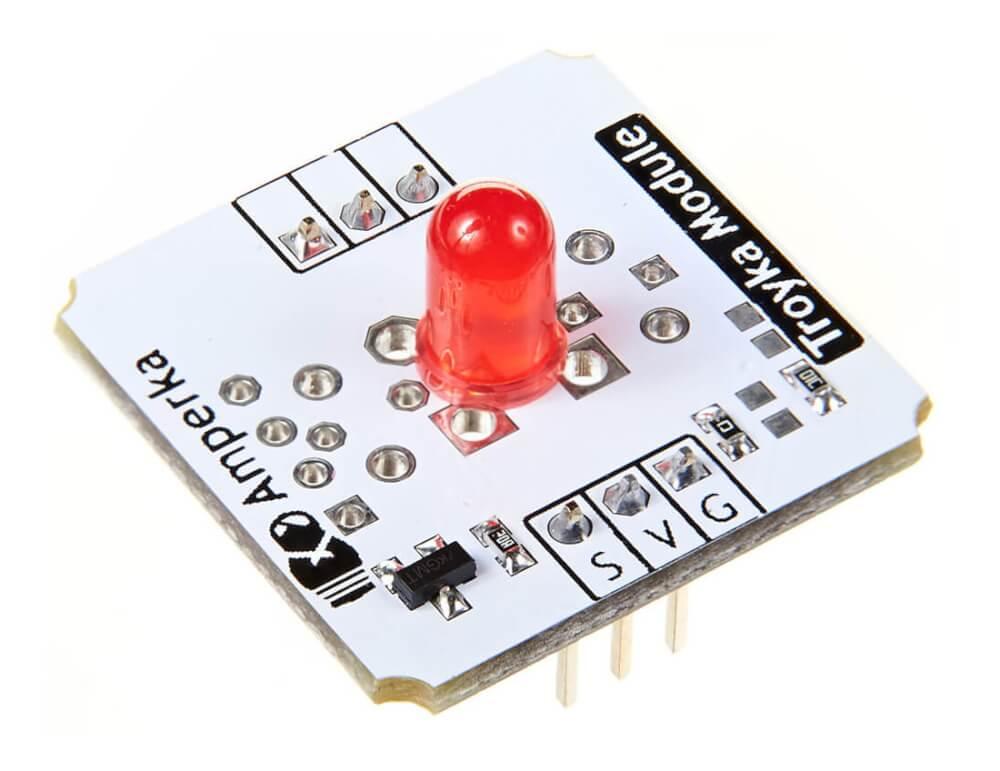 Використовуйте світлодіод 5 мм з лінійки Troyka-модулів для кольорової індикації різних процесів. Вам не доведеться поратися з пайкою, дрібними компонентами на макетці або турбуватися про правильний струмообмежуючий резистор та силовий ключ — все вже готове.