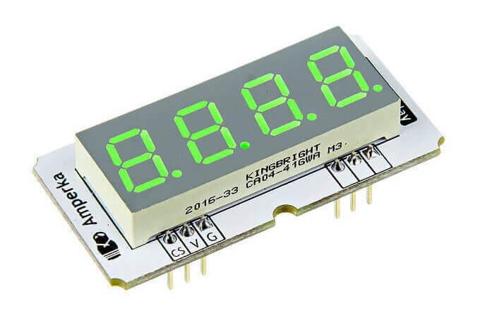Дисплей з чотирьох семисегментних індикаторів з лінійки Troyka-модулів — найпростіший спосіб виводити числа та буквені примітиви. Дисплей підійде для відображення показань сенсора або виведення поточного часу. З екраном просто та легко працювати, вам не доведеться поратися з пайкою, десятками резисторів та дротів на макетці — все вже готове.